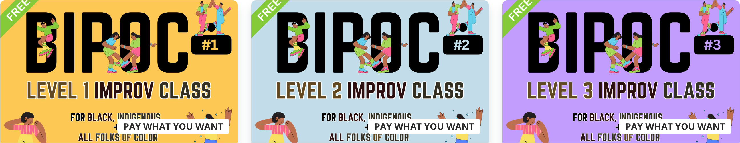 The Curious BIPOC program offers the first THREE LEVELS of our Improv Student Journey to enable ease of access and welcome Black, Indigenous, Latine, Asian, and all people of color to come together, to learn about improv, and to share joy in community.